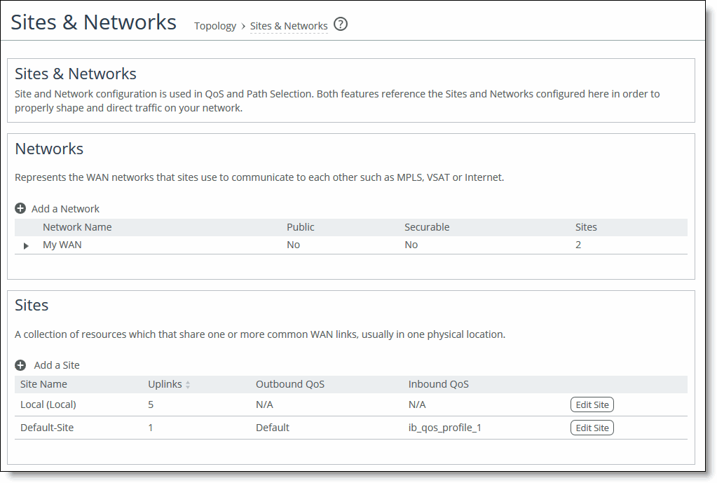 Define the discrete physical locations on the network. A site can be a single floor of an office building, a manufacturing facility, or a data center. Sites can be linked to one or more networks. The local sites use the WAN in the network definition to connect to the other sites. The default site is a catch-all site that is the only site needed to backhaul traffic. Use sites with QoS.