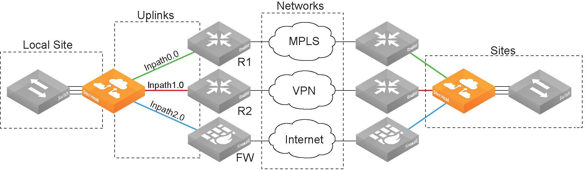 The local appliance’s network and site configurations are used in QoS and path selection to properly shape and direct traffic on your network. Networks represent the WAN networks (MPLS, VSAT, internet) used for site-to-site communication. Sites represent collections of resources that share common WAN uplinks. The networks and sites you configure on the local appliance appear in its QoS and path selection Management Console pages.