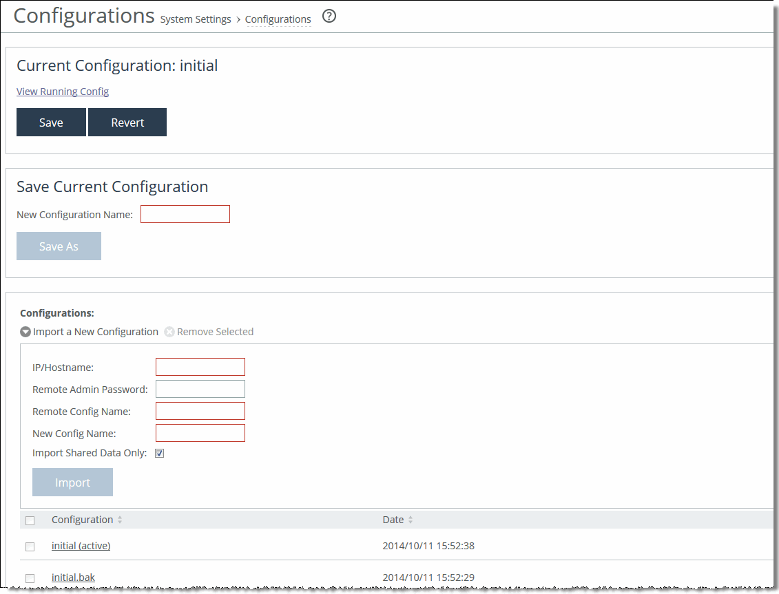 To import a configuration from another appliance, these configuration options are available: