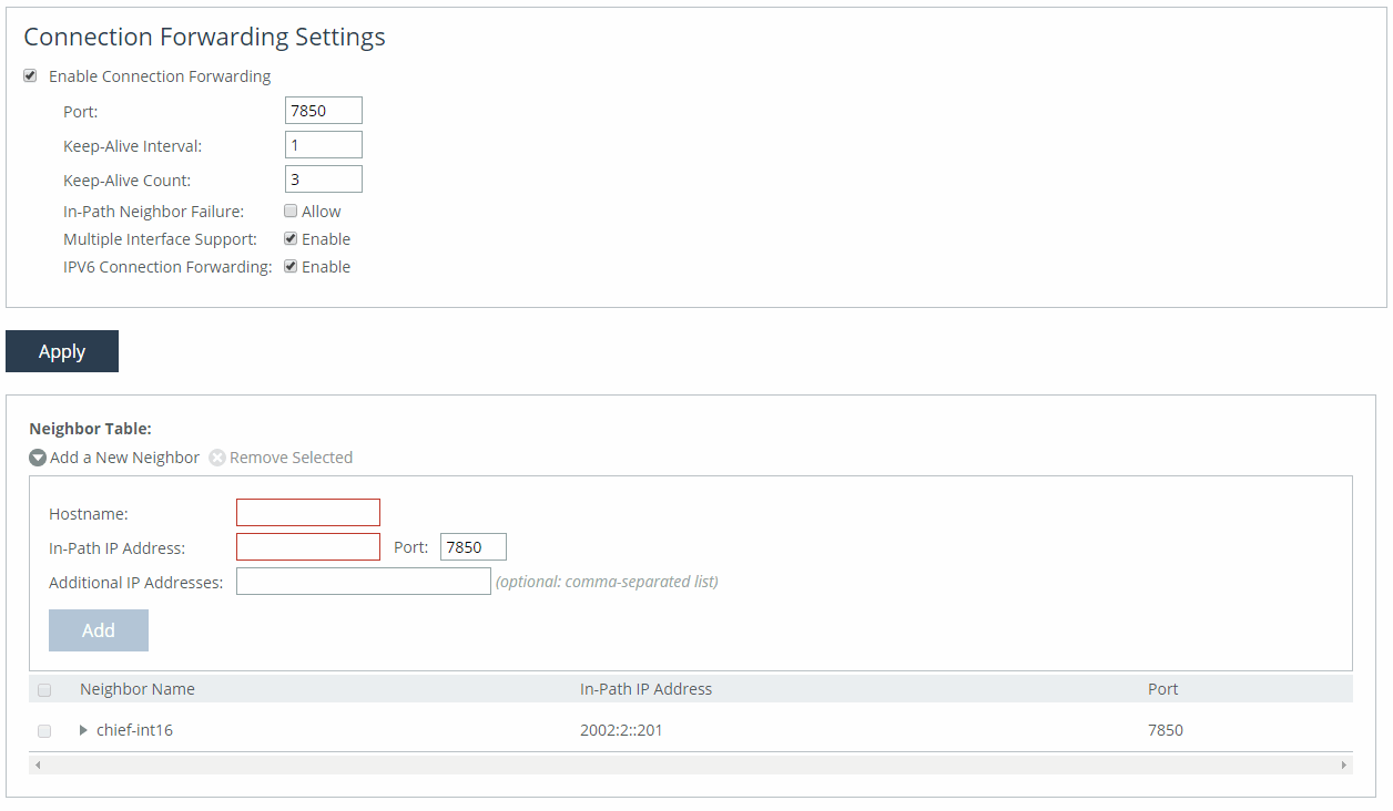 Allows IPv6 addresses to be entered in the Neighbor Table area of this page, in the In-Path IP Address and Additional IP Addresses fields.