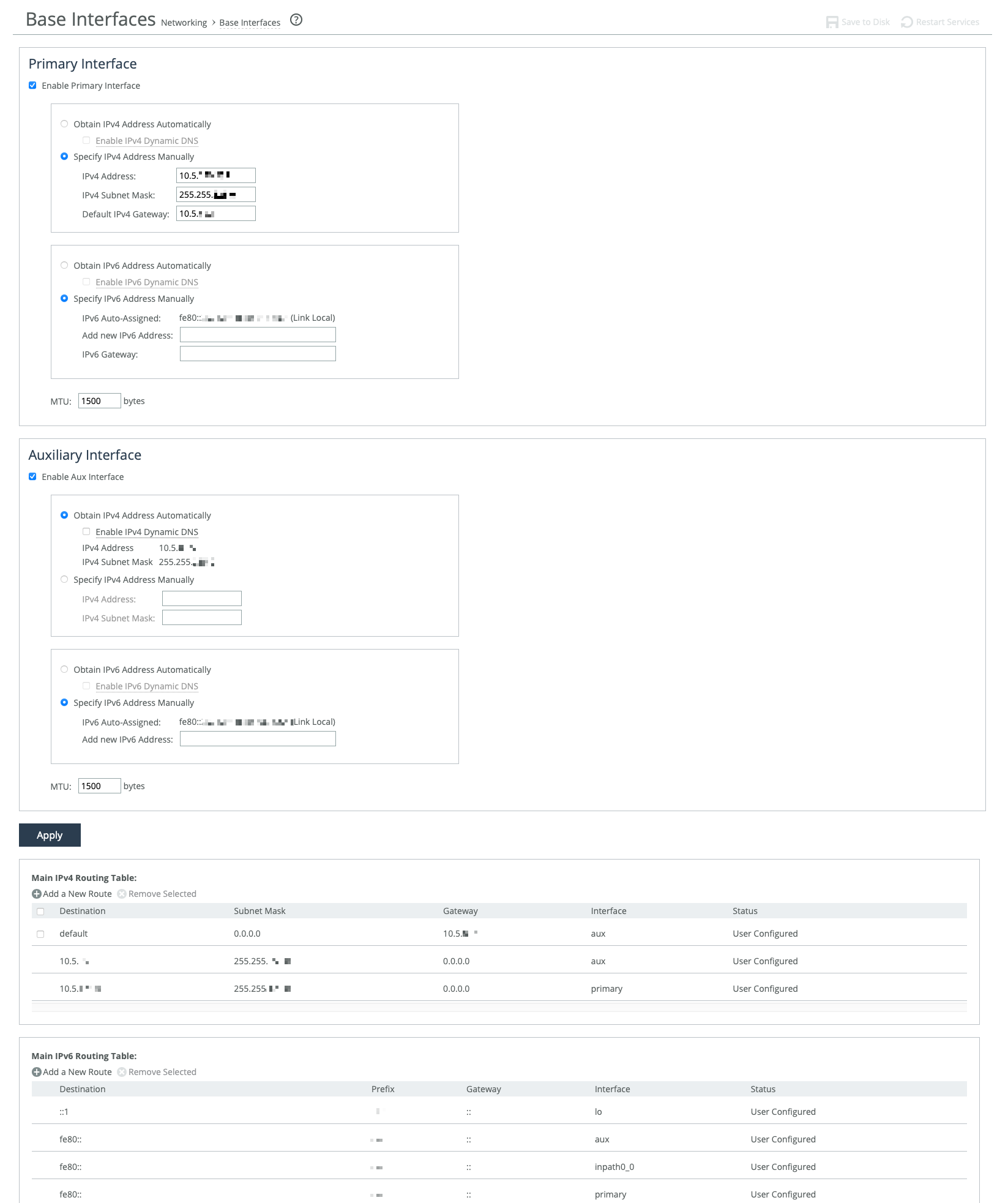Settings for the appliance’s primary and auxiliary interfaces are under Networking > Networking: Base Interfaces. Routing table settings are also available there. IPv4 and IPv6 are supported.