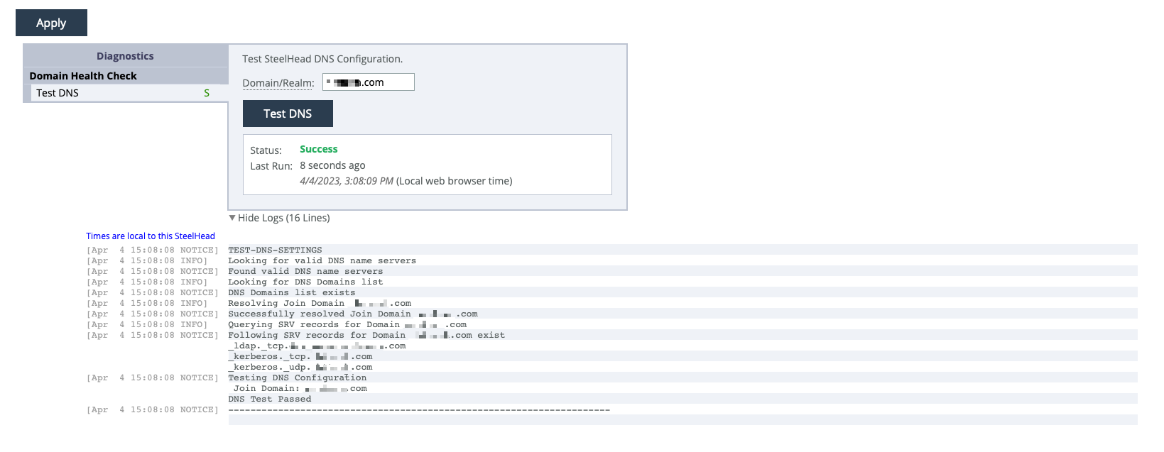 A DNS test tool is available at the bottom of the page to quickly check your appliance's DNS setup.