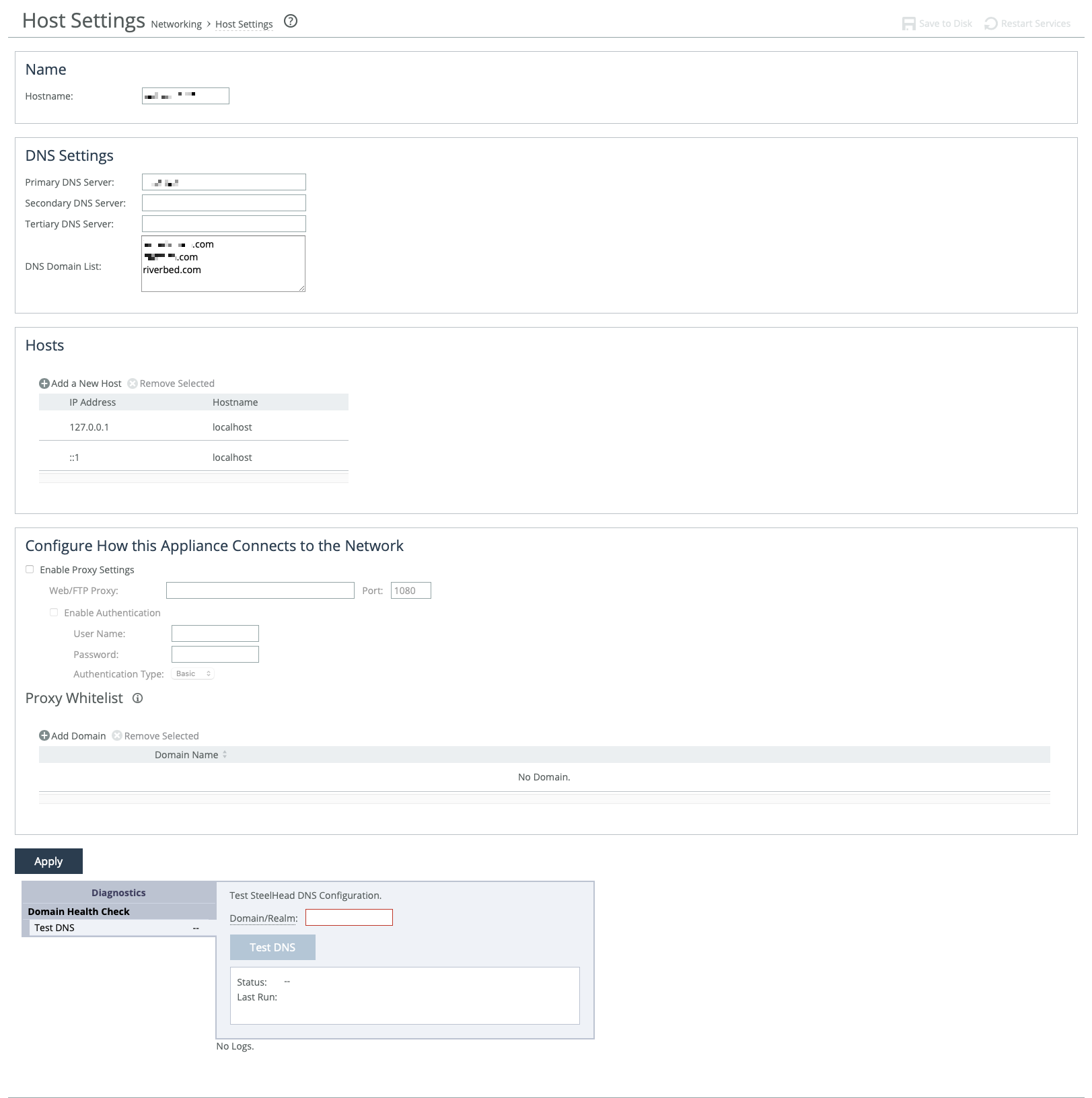 Host settings—including base (primary, auxiliary) and in-path interfaces—are usually set during the appliance’s initial setup. Only change them if necessary and if you’re sure about what you're doing.