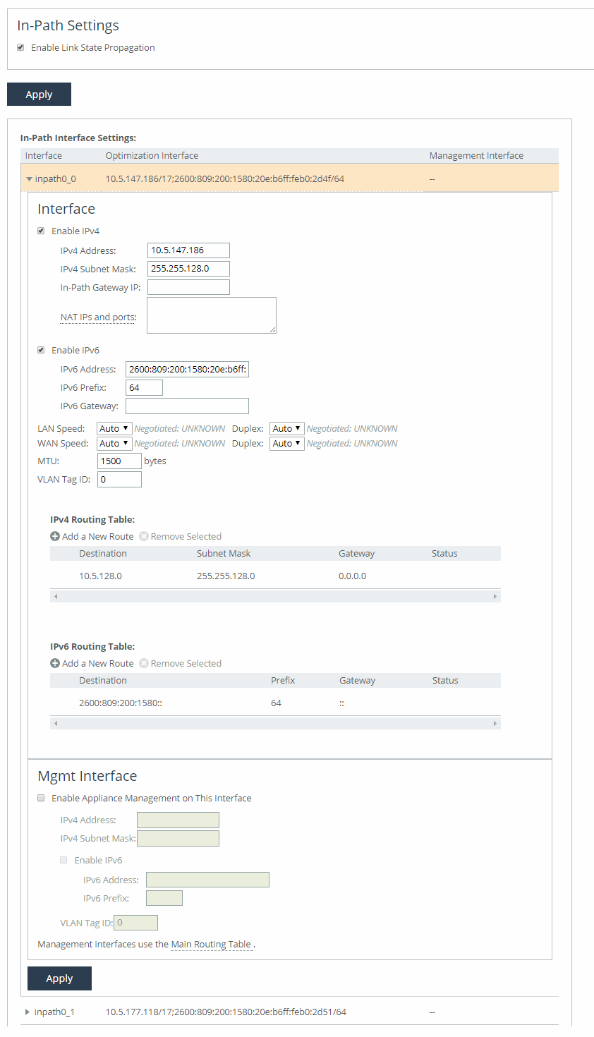• For IPv4, if you have a router (or a Layer-3 switch) on the LAN side of your network, specify this device as the in-path gateway. For IPv6, you can use a link local address.
