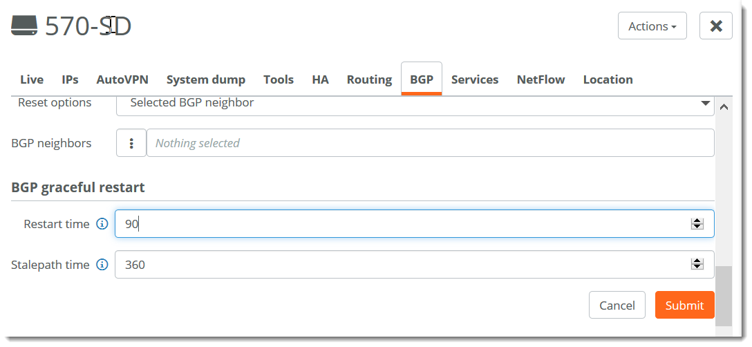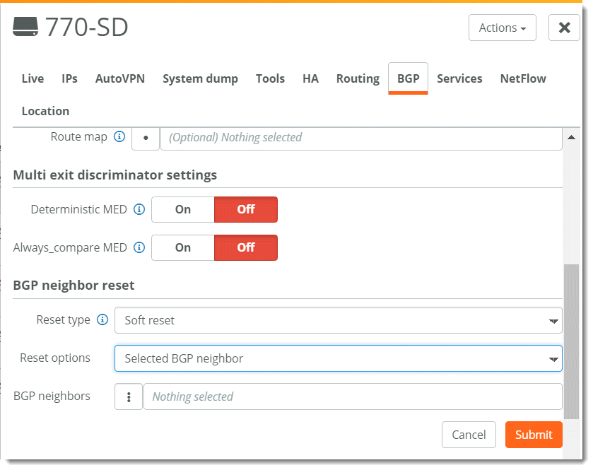 For SteelHead SD appliances, you can only add BGP neighbors under the Appliances > BGP tab. You can’t add BGP neighbors from the Routing > BGP page.