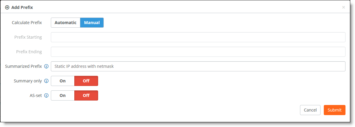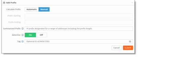 • Summarized Prefix - Specify the IP prefix designated for the range of addresses, including the prefix length.