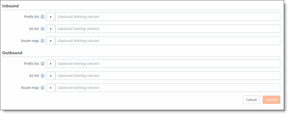 We recommend you define route maps, AS lists, and prefix lists before you configure the inbound and outbound settings. For details on configuring routing policies, see