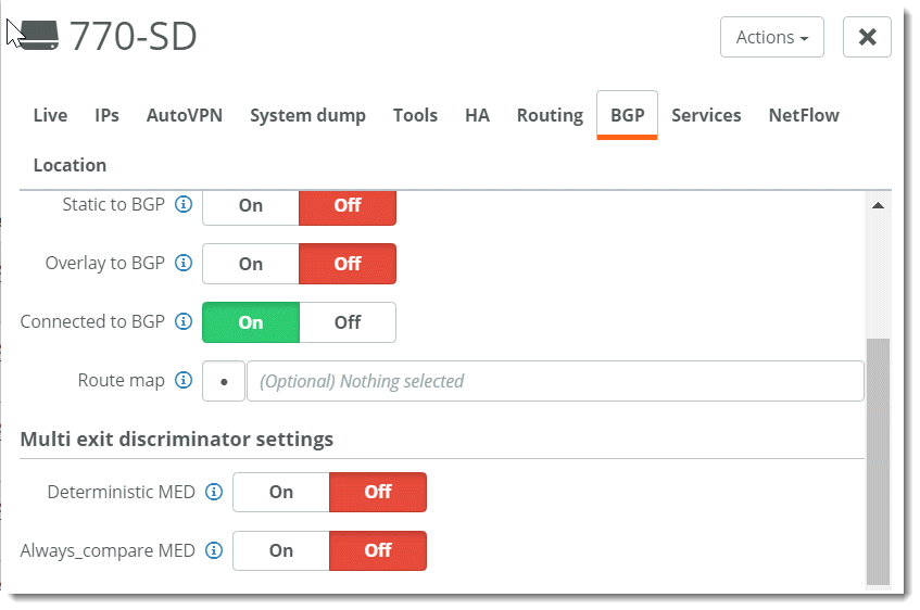 3. Open the BGP tab and click On for Overlay to BGP and click On for Connected to BGP.