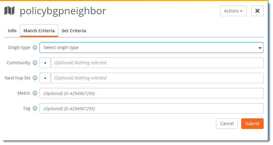 8. IBP metric - You configure this value when you create BGP routing polices (Routing > Route Maps: Add Route Map). For example, when you create a route map with the use case: Policies at the BGP neighbor level. If there is no external route selection path, the path with the lowest IGP value to the next hop is preferred. The IGP route is interior to the AS of origination. For details, see