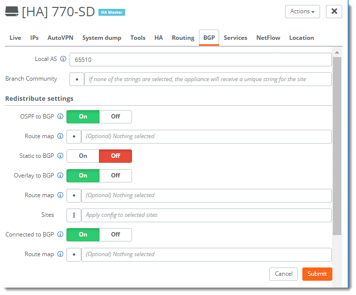 • For SteelHead SD appliances deployed in HA mode, you need to redistribute the overlay network and connected routes into iBGP.