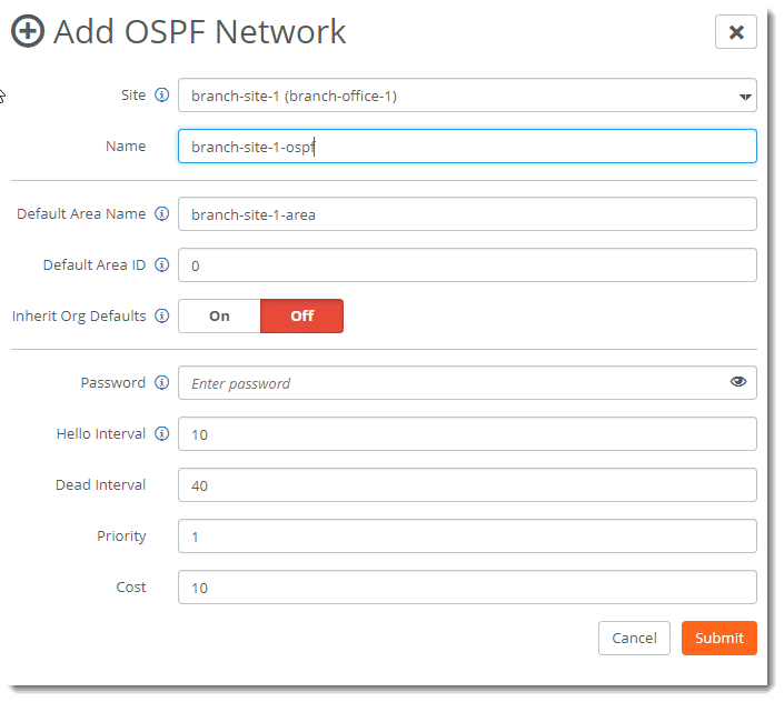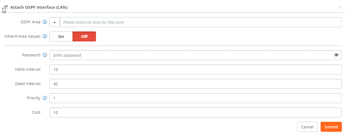 • Inherit OSPF Network Values - Click On to allow the OSPF network to inherit the OSPF network values previously configured, such as password, hello interval, dead interval, priority, and cost.