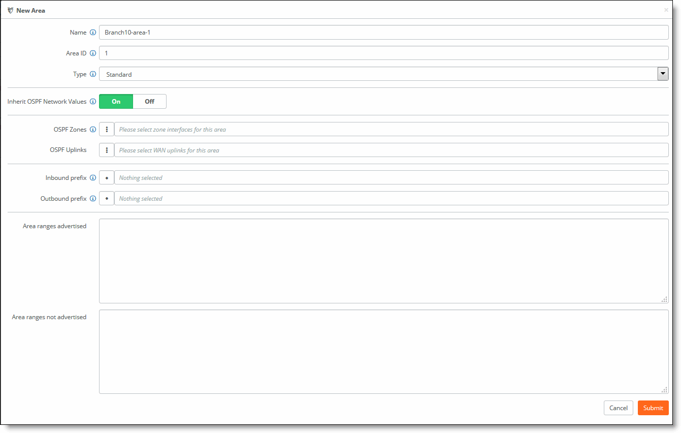 • Outbound prefix - Optionally, specify the outbound prefix. Any prefixes defined in this prefix list are used to filter networks advertised from this area.