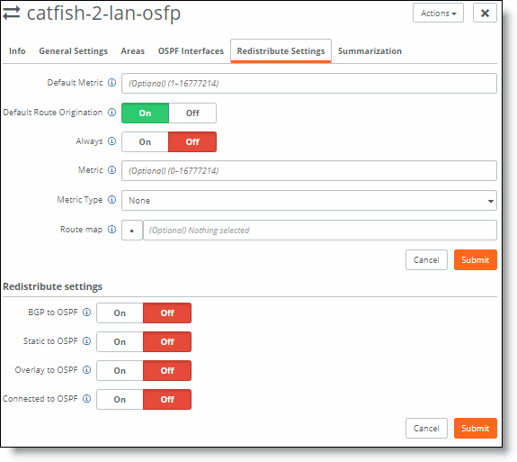 5. Under Redistribute settings, specify your OSPF redistribution settings: