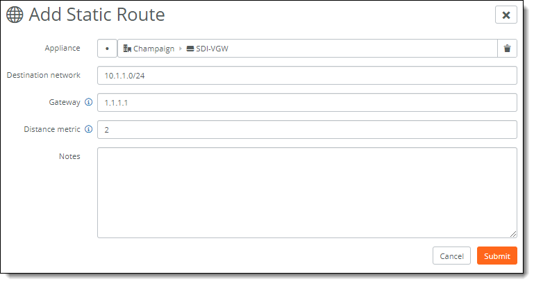 SteelHead SD provides static routing at the appliance level where it essentially acts as a router. The static route is not tied to a particular zone. Static routes: