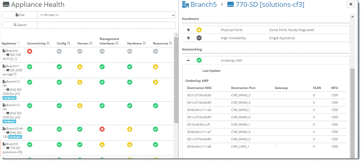 SCM displays the underlay Forward Information (FIB) and Address Resolution Protocol (ARP) tables for SteelHead SD 570-SD, 770-SD, 3070-SD appliances and the SteelConnect SDI-2030 gateway located at the branch.