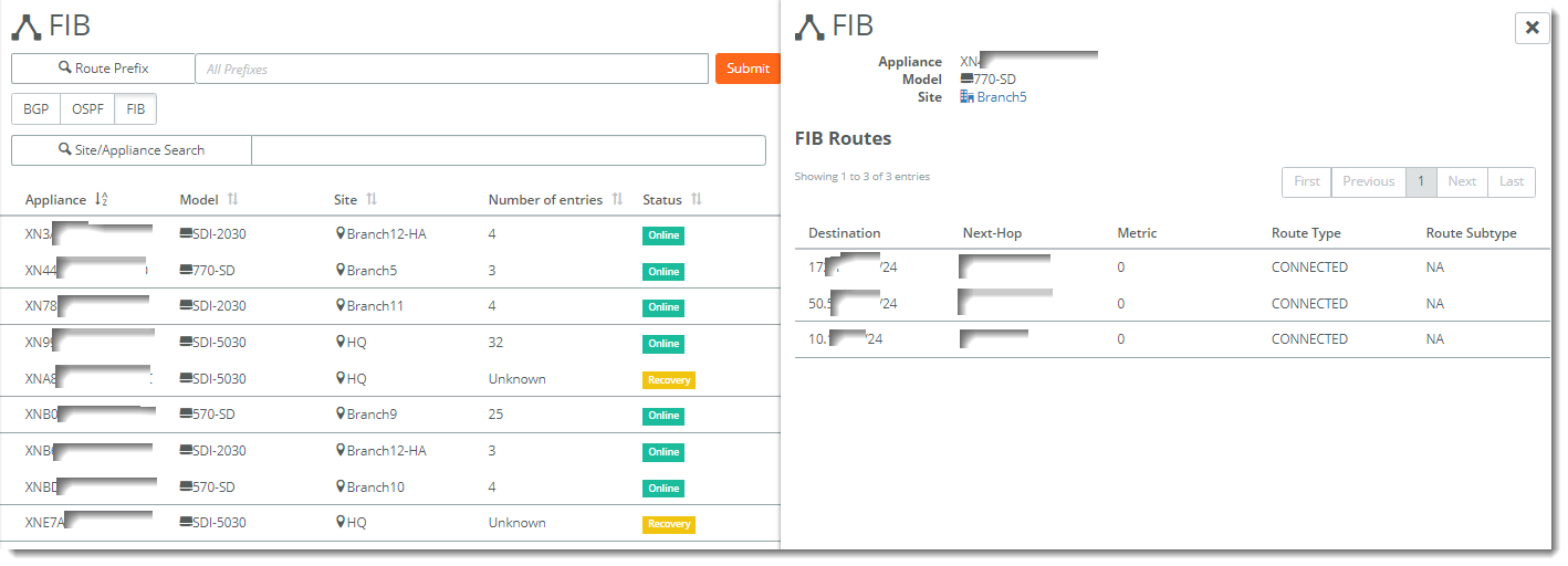 2. Select the FIB Tables tab to display the FIB tables for all the appliances in the organization. You can search for an appliance by serial number or search for appliances by site name.