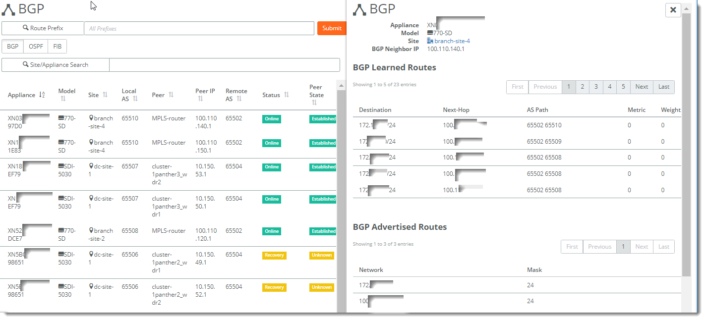 3. To display the BGP tables for all the appliances in the organization, select the BGP Tables tab. All the BGP learned and advertised routes are displayed. You can search for an appliance by serial number or search for appliances by site name.