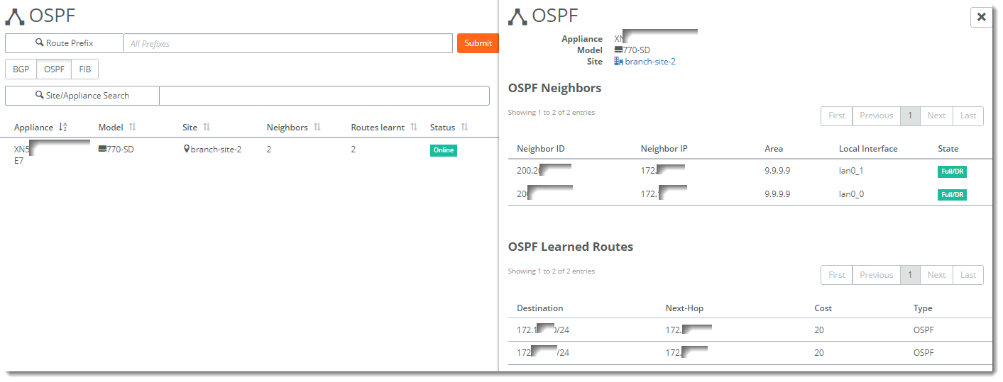 OSPF appliance neighbors and learned routes