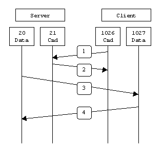 1. The client from a random TCP source port greater that 1024 (shown here as port 1026) connects to the server on port 21 to establish the control connection. The client sends the server the port to establish the data connection on (shown here as TCP port 1027).
