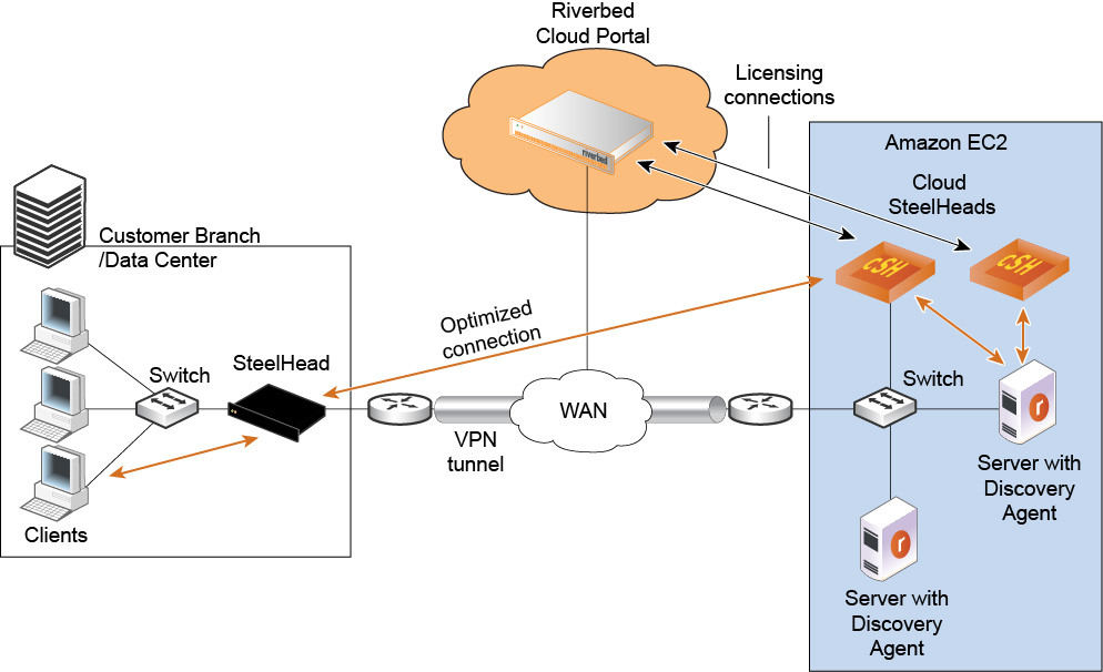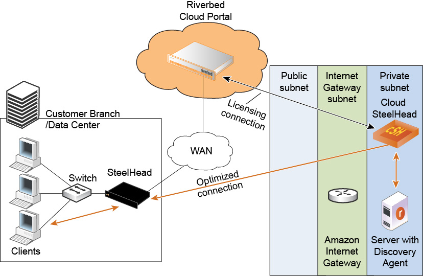 SteelHead-c and Discovery Agent servers. It also detects the elastic IP address that you manually configure using the AWS console. Ensure that you configure the ACL and security groups in the AWS console so that the SteelHead-c can communicate with the Riverbed Cloud Portal.