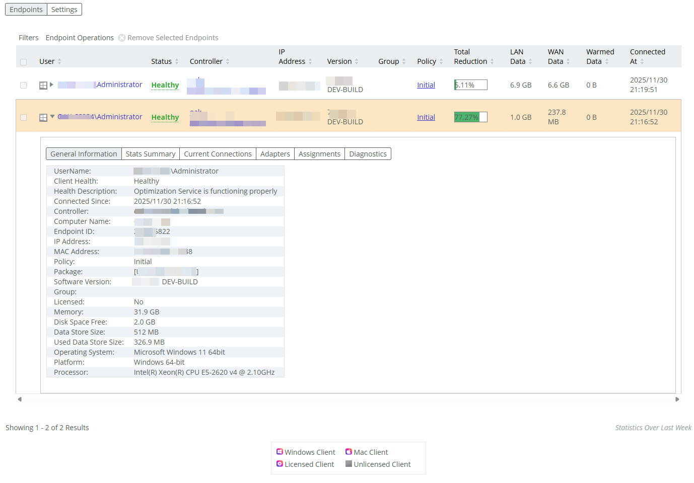 The Endpoint report displays icons for both types of clients: Windows or Mac. The icons appear dimmed if the client is unlicensed, and they appear bright orange if the client is licensed.