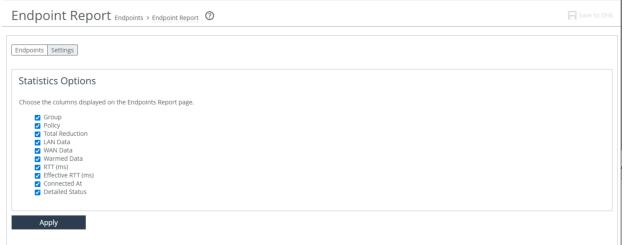 About Controller Clusters. The Endpoint report for SteelHead Mobile (formerly Client Accelerator) 5.5 and later also has a Settings tab that lets you choose the columns that appear in the report. In addition, on the Endpoints tab, three sub-tabs let you filter the report contents, perform system operations on endpoints, and remove one or more selected endpoints as shown here: