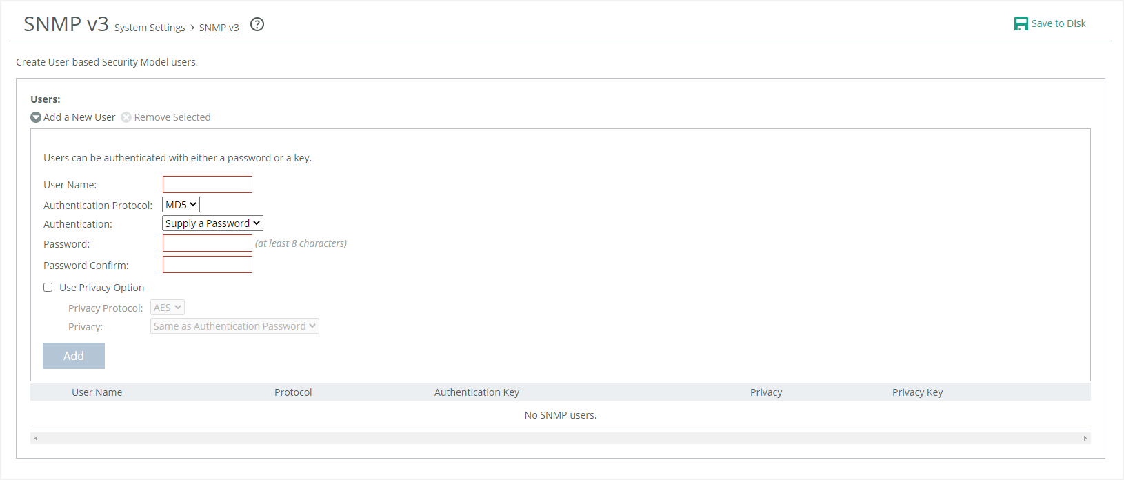 1. Create the SNMP-server users. Users can be authenticated using either a password or a key.