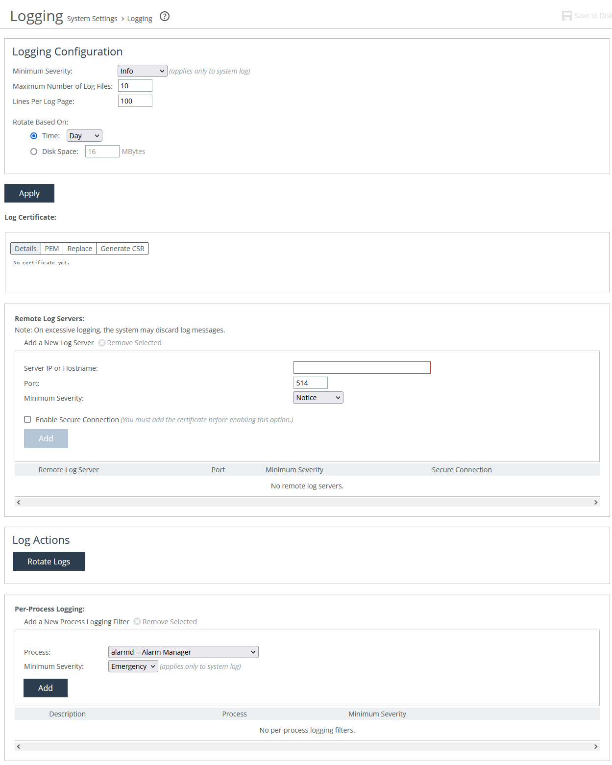 You can send logs to remote log servers. When adding remote servers, you’ll need those servers’ IP addresses. You can also specify the minimum severity to filter which messages are sent.