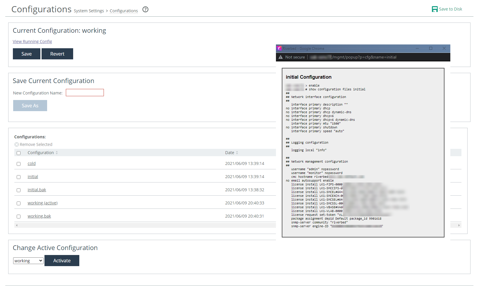 The appliance has an active, running configuration and saved configurations. When you apply changes to appliance settings, the changes are applied to the running configuration, but not saved to disk. When you save settings changes to disk, the system creates a backup of the configuration as it was prior to your changes, and then applies the changes to the running configuration. See