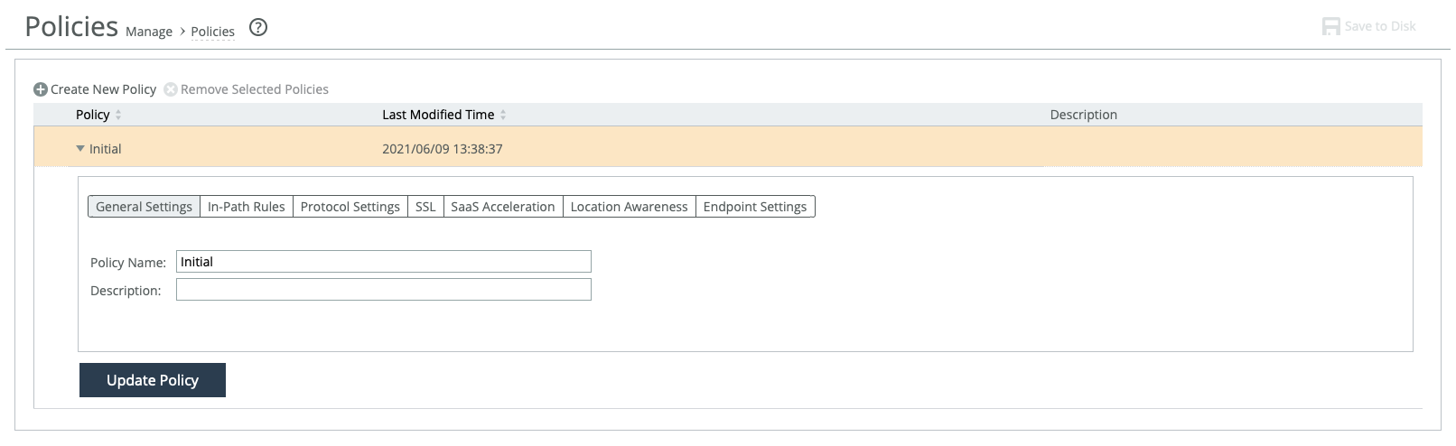 Initial, is suitable for standard in-path deployments, and you can deploy client software packages using this policy without modifying it. You can also create customized policies. If you do not specifically add a policy to a group, the group will use the default policy. For details on settings for the