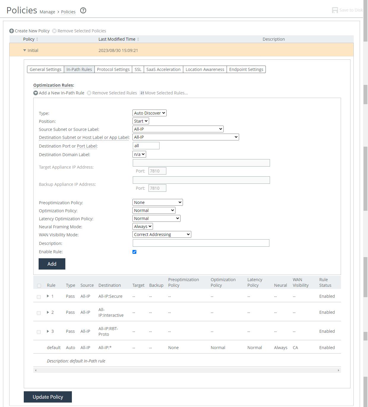 When you have finished configuring the new in-path rule, click Add and Update Policy to add the new rule and update the policy.