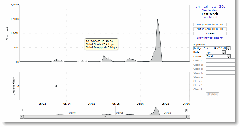 Classes | Select Total or Selected classes from the drop-down list. Selected classes lets you narrow the report by choosing from drop-down lists of classes and remote sites (up to seven). You can’t select a class or a class @ site more than once. Click Update to change the QoS class selection without updating the chart. When the report display includes the total classes, the data series appear as translucent; selected classes appear as opaque. When the report display includes the total classes, the navigator shadows the total sent series. When the report display includes selected classes and remote sites, the navigator shadows the first nonempty sent series. A data series can be empty if you create a QoS class but it hasn’t seen any traffic yet. Selecting a parent class displays its child classes. For example, the report for an HTTP class with two child classes named WebApp1 and WebApp2 displays statistics for HTTP, WebApp1, and WebApp2. When a selected class has descendant classes, the report aggregates the statistics for the entire tree of classes. It displays the aggregated tree statistics as belonging to the selected class. |