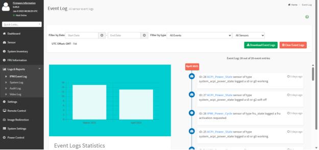 • IPMI Event Log page—Displays a list of events from the sensor event logs for the appliance. You can filter by date, event type, and sensor component. You can clear and download event logs. Mouse over the graph to view the number of events by date. You can also select between BMC or Client Time zone. Click a record to see the details of that entry. Clearing event logs deletes all existing records for all sensors.