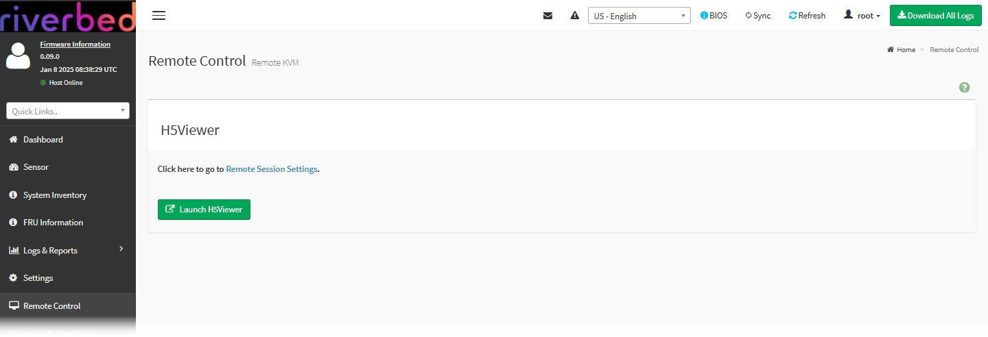 • Choose Remote Control, and click Launch H5Viewer to launch a remote KVM session for the appliance.