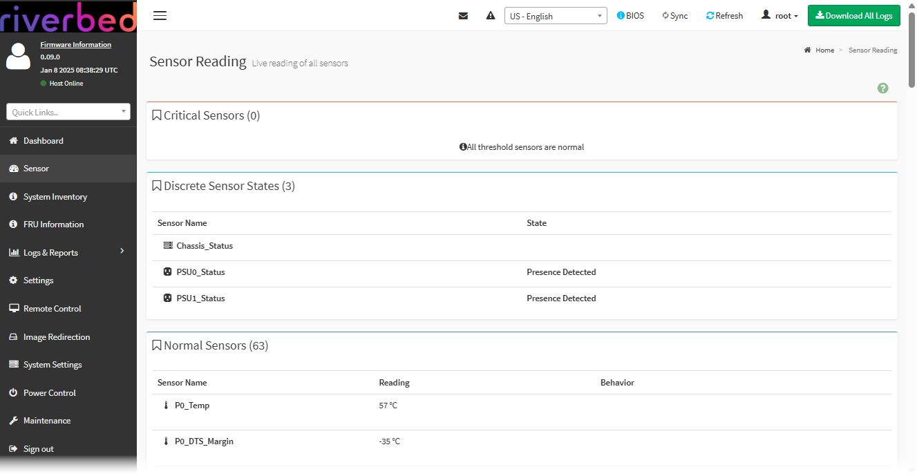 The Sensor Reading page displays all critical sensors, discrete sensor states, normal sensors, and disabled sensors. You can view sensor details and change sensor threshold (if supported on the sensor).