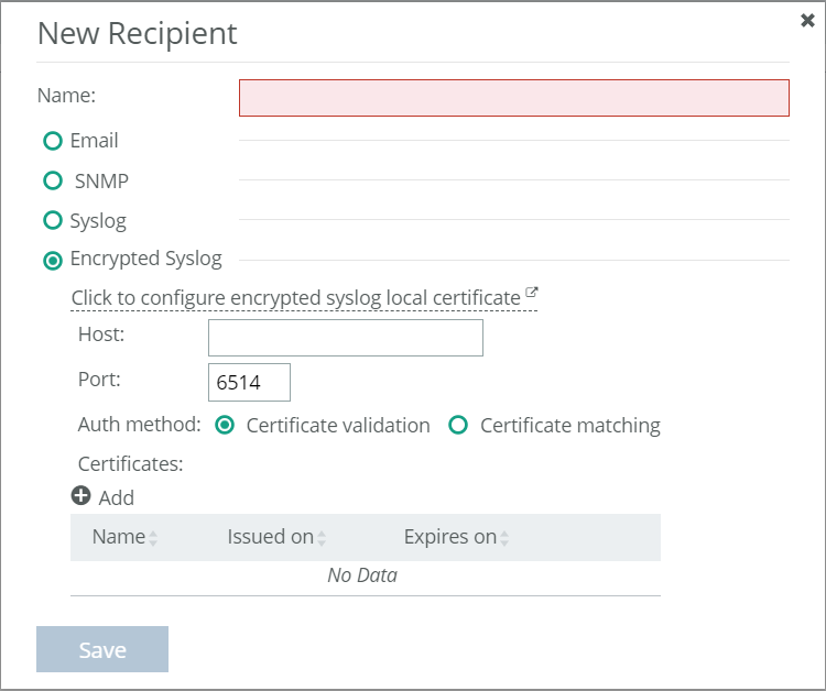 4. Select the type of the recipient: Email, SNMP, Syslog, or Encrypted Syslog, with each recipient being a single type. Selecting an option makes relevant fields for it accessible. Specify the details that will enable a notification to reach that recipient.