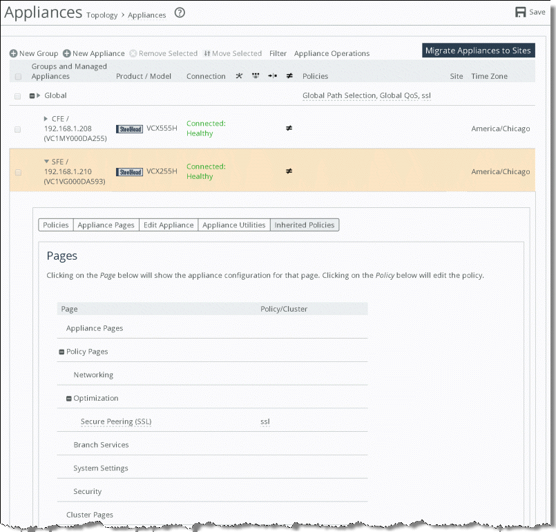 Figure: Inherited policies view shows a SteelHead in the New York site (CFE) that doesn’t have a policy specifically assigned, so it inherits properties from the SSL policy, which is assigned to the group Global. The other SteelHead in a different location (SFE) can have different policies assigned. Individual settings in this policy override settings in the Global policy.