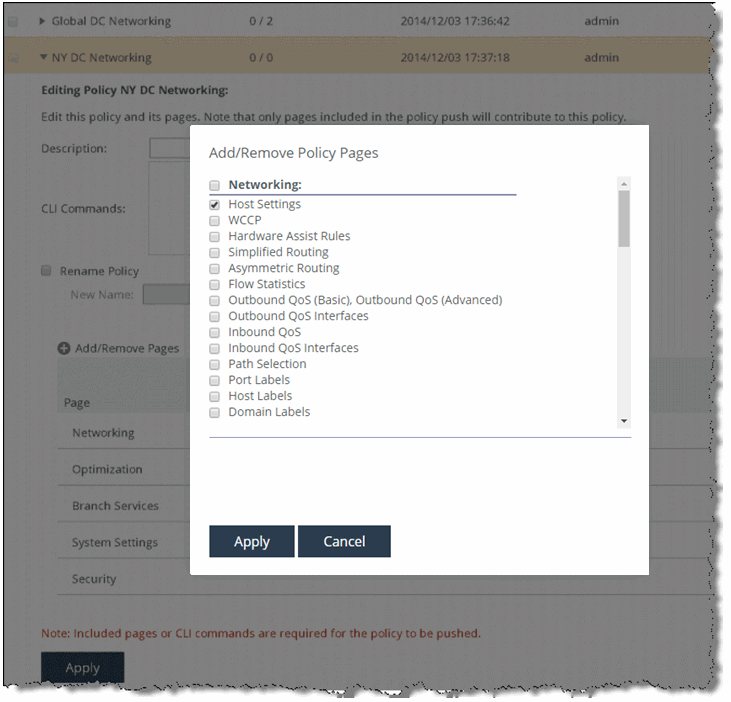 Figure: Editing page for global dc networking policy shows that the WCCP page check box is not selected and the Host Settings page check box is selected. These selections indicate that WCCP settings aren’t configured by this policy, but that Domain Name System (DNS)—and other host settings—are configured by this policy.