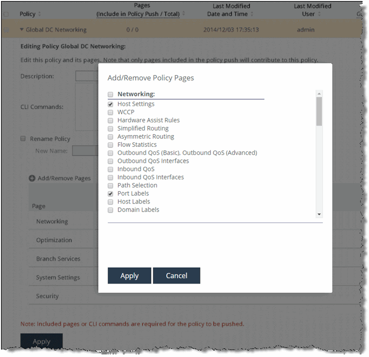 For example, a networking policy can configure Web Cache Communication Protocol (WCCP). It is unlikely that the WCCP configuration is the same across all data centers, so a Global DC Networking policy doesn’t need to include the WCCP settings. You can have the same Network Time Protocol (NTP) servers across all sites and belong to the same global policy.