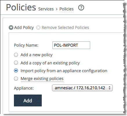 You create policies on the Policies page. In environments in which there are preexisting supported Riverbed appliances deployed, you can use SCC to import the settings of these appliances into a policy. Importing allows you to quickly reuse and apply these settings to another appliance rather than creating them again in a new policy. To import the settings from a managed appliance, choose Manage > Services: Policies > [the appliance that you want to import from] and select Import policy from an appliance configuration (