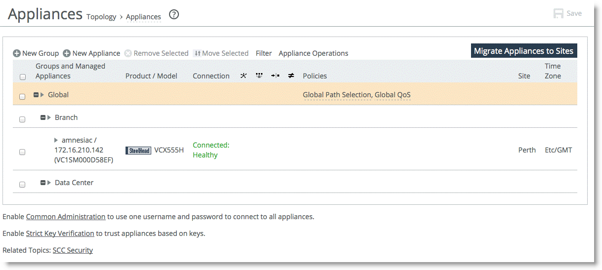 The SCC uses a hierarchical group model. The SCC defines the group hierarchy with the default Global group as the root. All user-defined groups and managed appliances are contained within the Global group. A managed appliance can be a member of only one group.