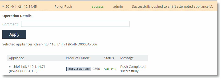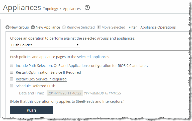 Existing settings in a SteelHead do not change until the new policy is pushed. The Push Required symbol is shown in