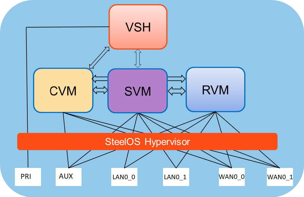 The SVM and RVM connect to all ports on the SteelHead SD appliance except for the primary port. The primary port (PRI) is connected directly to the VSH. The CVM is connected to the auxiliary (AUX) port and the WAN uplinks only. All the data and control packets are handled by the SVM and RVM.