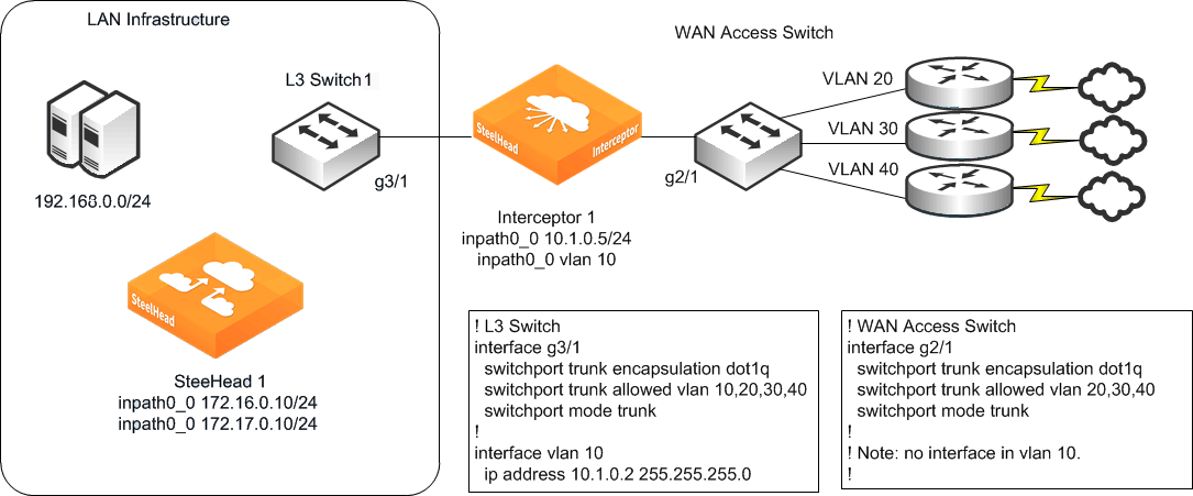 WAN access switch used to aggregate WAN traffic through a single 802.1Q trunk link. Because the WAN access switch doesn’t have Layer-3 addressing, the Interceptor must use Layer-3 Switch 1 as its default gateway. Layer-3 Switch 1 must have Layer-3 access to all remote sites that are optimized. The Interceptor can redirect traffic for optimization on all VLANs passing through the link, not just VLAN 10.
