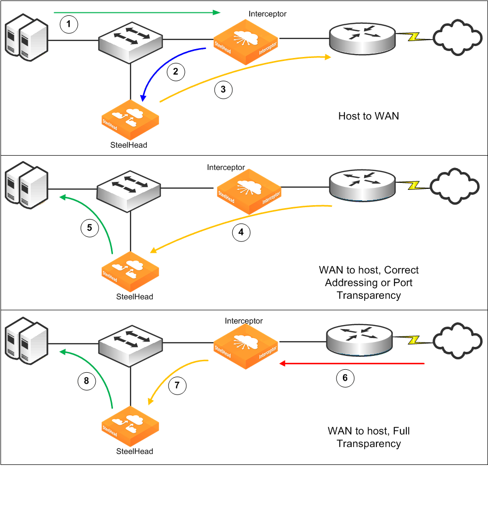 Interceptor 7.0 supports for full and port transparency WAN visibility modes. For more information about full and port transparency, see the SteelHead Deployment Guide.