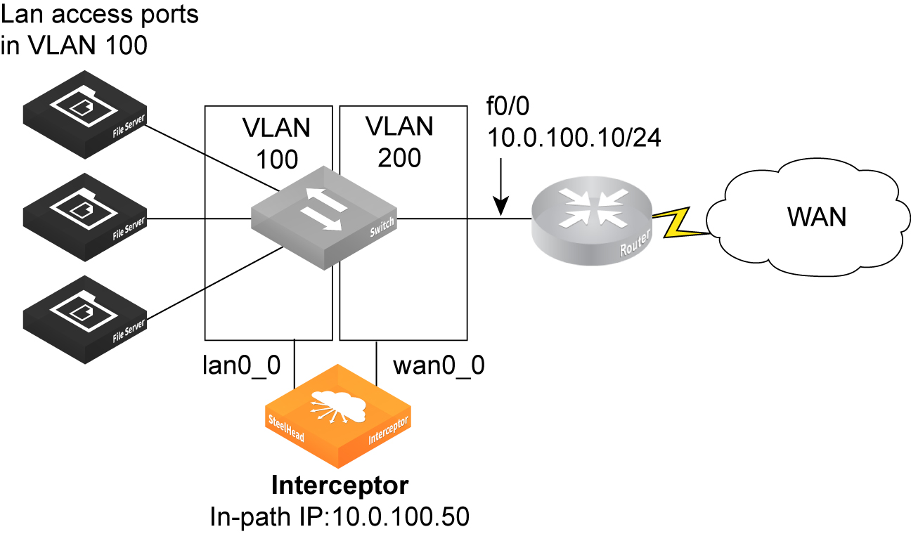 You can configure each Interceptor in-path interface with a VLAN ID. The Interceptor can optimize any traffic on the trunk and the native VLAN. When packets are sent from the in-path interface (for example, connection-forwarding traffic), the in-path VLAN tag is used. Configuration of the in-path interface VLAN ID is needed only if the in-path interface IP address belongs to a subnet whose traffic arrives on the LAN‑connected or WAN-connected equipment with a VLAN tag. For example, if the in-path IP is on the untagged native VLAN, then you don’t need the VLAN ID configuration.