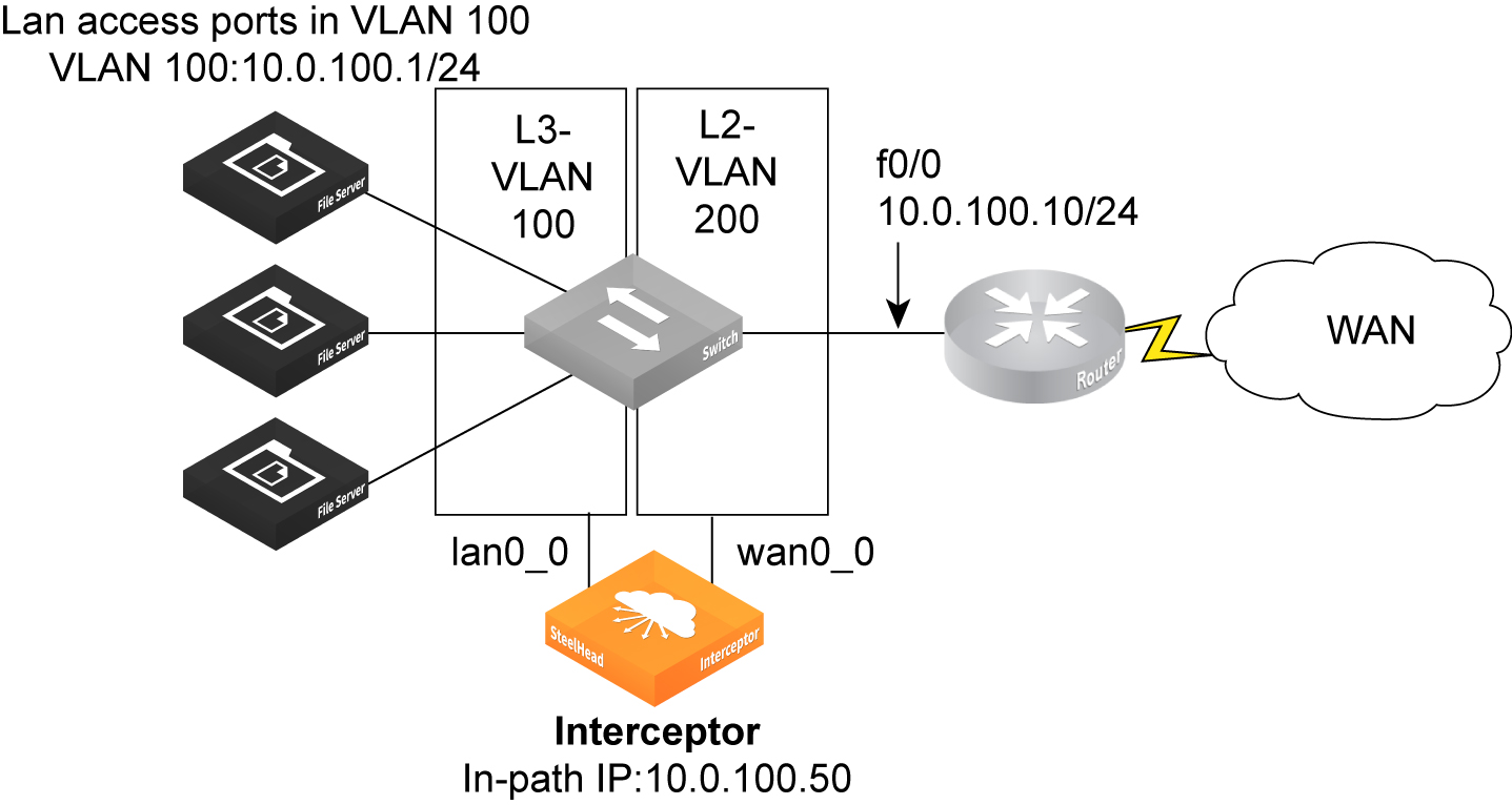 The term VLAN bridging refers to a network design in which both the LAN and WAN ports of an Interceptor's in-path interface are connected to a single switch or router. The switch or router is then configured so that traffic to be optimized must pass through the Interceptor—by forcing the traffic's Layer-2 path to or from the WAN to pass through the in-path interface.