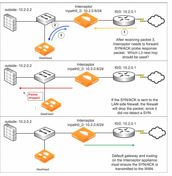 If a firewall or other security device is used as a Layer-3 next hop for the Interceptor or SteelHead, the routing and default gateway configuration on the Interceptor and SteelHead is configured so that the firewall detects all or none of the packets associated with the autodiscovery process. For details, see