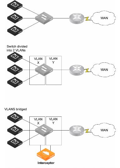 A VLAN bridging deployment has the same features and functionality as a physically in-path Interceptor, with the exception of 802.1Q VLAN trunking.