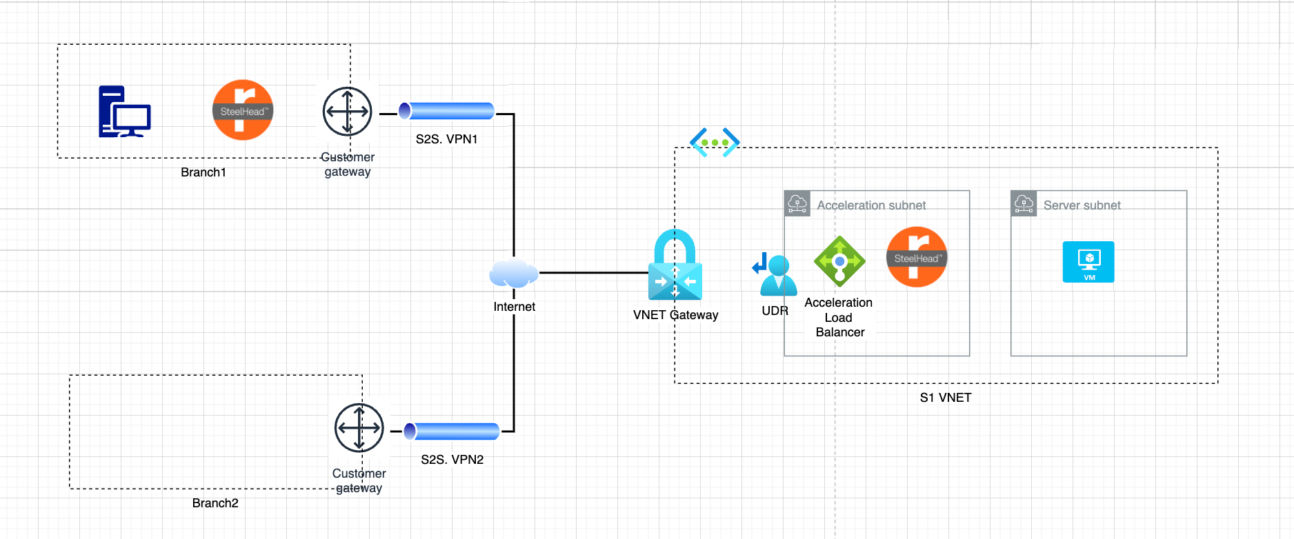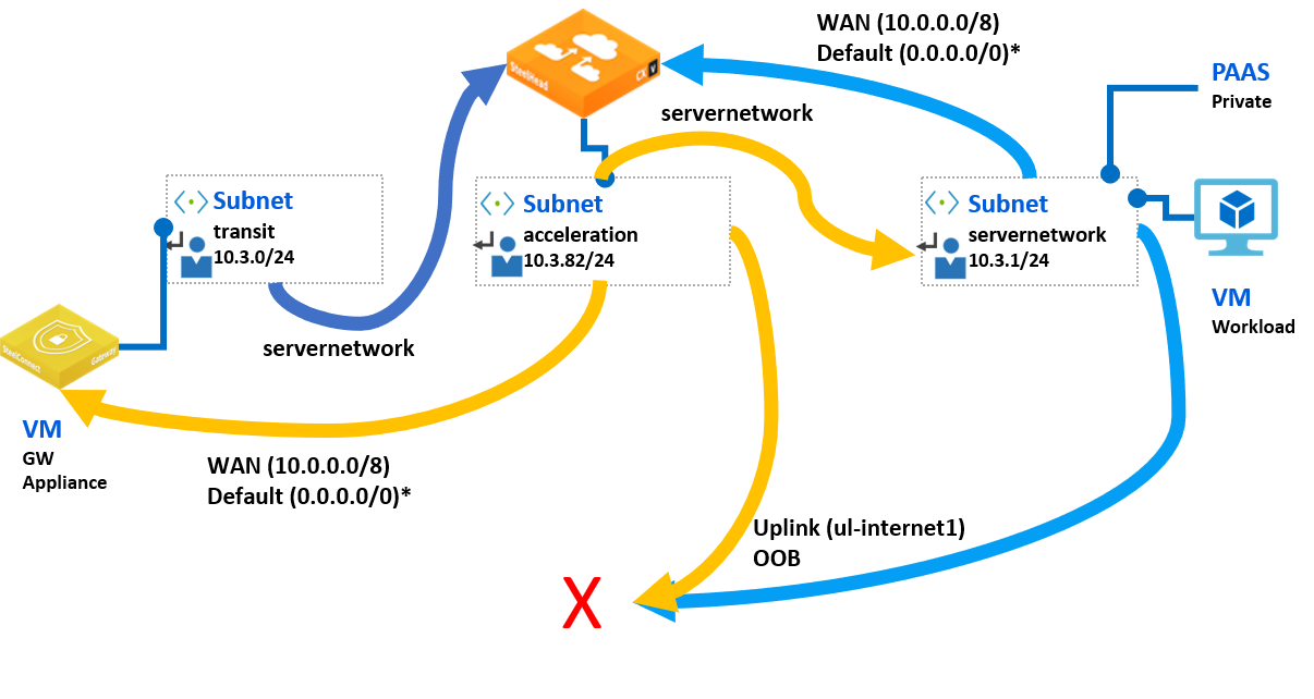 Azure routes traffic between all subnets within a virtual network, by default. You can create your own routes to override Azure's default routing. These user-defined routes (UDRs) are helpful when, for example, you want to route traffic between subnets through a network virtual appliance (NVA). For example, the following diagrams show traffic flowing between a server subnet and an acceleration subnet. The acceleration subnet connects to a VNET gateway using user-defined routes. Branch offices connect to the VNET gateway over the internet.